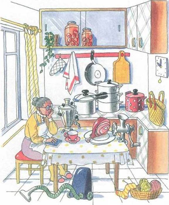 Помоги бабе Соне отыскать предметы, которые нужны, чтобы связать носки, сварить суп, сварить сок (соковарка, абрикосы), вскипятить чай, сделать мясные котлеты, быстро сварить мясо (скороварка), навести порядок в доме. Что еще из изображенного начинается на «С».