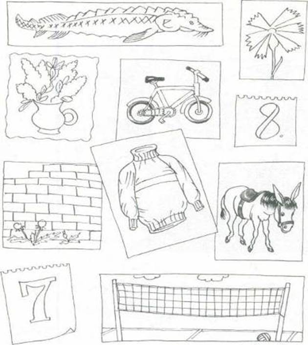 Рассмотри и назови предметы, спрятанные художником. Обведи контуры предметов разными карандашами. Сколько предметов нарисовал художник? С какого звука начинаются все эти слова?