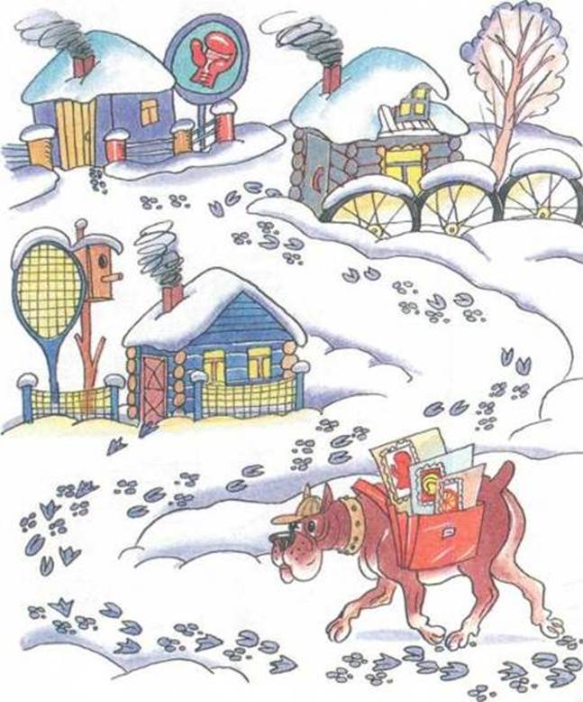 Боксер несет письма своим друзьям: лосю, гусю, рыси. Помоги отыскать боксеру домики друзей. Где чей след? (рысий и т.д.) Где чей домик? (гусиный и т.д.) Внимательно посмотри на домики и скажи, кто из друзей теннисист? велосипедист? боксер? Догадайся, кому какое письмо. О каких боксерах идет речь в предложениях: 1. По следу идет... 2. На ринге дерется...