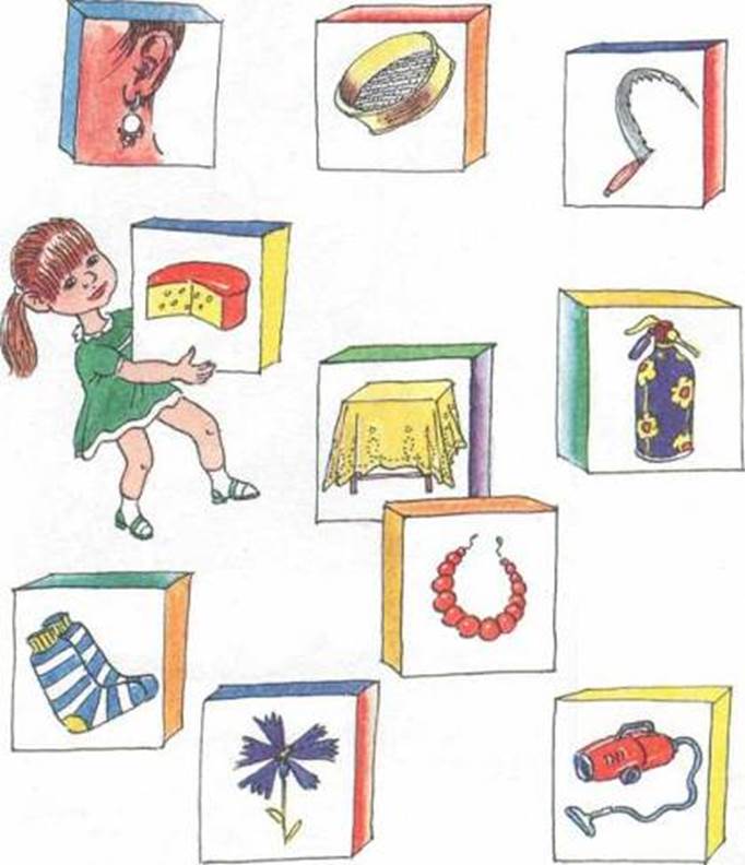 Помоги хозяйке навести порядок на кухне: распредели предметы по местам: а) в холодильник (как ты назовешь эти предметы?); б) на полки и плиту (назови эти предметы одним словом); в) на стену; г) в мусорное ведро.