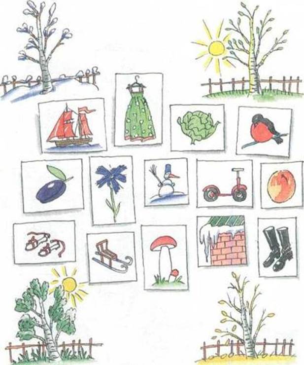 Зима, весна, лето, осень - что это? Покажи эти времена года на картинках. Как ты догадался? Рассмотри картинки и скажи, что к какому времени года относится? Соедини каждую картинку дорожкой с нужным временем года. Как называется явление, когда с деревьев опадают листья? Когда это бывает? Посмотри на картинку и скажи: с каких деревьев ветер сорвал листья? Лист осины называют осиновым. А как называют лист дуба? клена? рябины? Найди дерево с самым толстым стволом. У какого дерева такой ствол? Что собирают лисички? Как ты думаешь, почему грибы называют «лисички», «подосиновики», «опята», «мухоморы». Какие из них съедобные? Какие ядовитые? Сколько и каких грибов собрали лисички? О каких лисичках идет речь в следующих предложениях: 1. На поляне играют... 2. Под деревьями растут...
