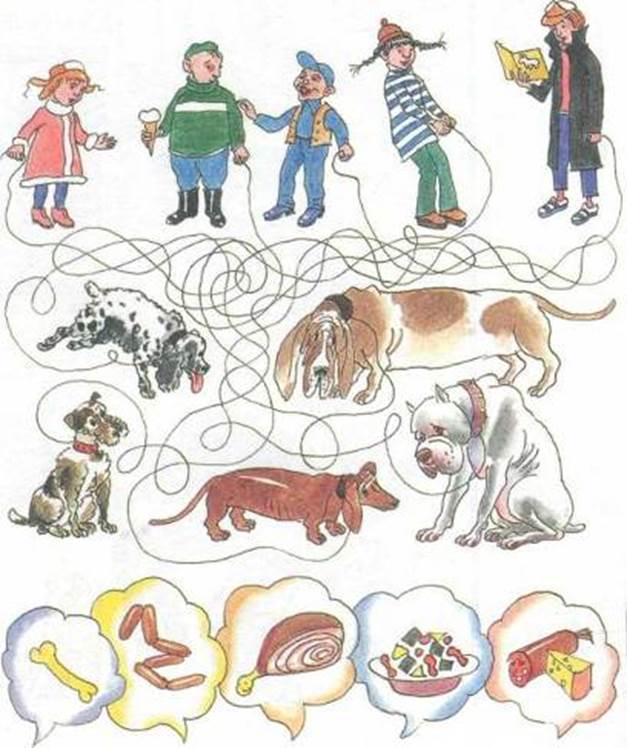 Посмотри на картинку и скажи, кого из детей как зовут, если Света светлее Сони, Саня самый высокий, Слава самый толстый, а Костя всегда веселый. У кого из них спаниель? такса? боксер? бассет? фокстерьер? Скажи наоборот: темный -...; низкий -...; грустный —...; худой —.... Посмотри на картинку внизу и скажи, что снится собакам.
