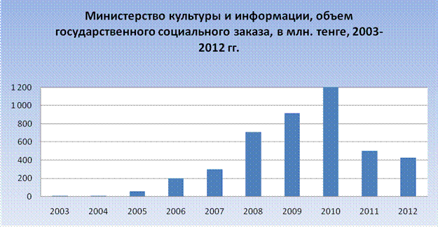 Ключевые позиции в воплощении государственного социального заказа изначально занимало министерство культуры и информации в качестве основного исполнителя и инициатора государственной поддержки НПО. Министерство культуры и информации - единственный государственный орган выделявший средства на государственный социальный заказ за весь период 2003-2012 годы. До 2010 года продолжался неуклонный рост объемов выделяемого МКИ РК государственного социального заказа. Пик роста обхемов государственного социального заказа приходится на 2010 год, когда было выделено 1, 2 млрд тенге, рост в 112 раза с 2003 годом. В 2011 году происходит более чем двухкратное снижение объемов государственного социального заказа в сравнении с предшествующим периодом: объем выделенных средств составлял 500 млн. тенге. Однако снижение объемов выделяемых средств никак не умаляет роли министерства культуры и информации в вопросах взаимодействия с НПО, что подтверждается закреплением за министерством статуса уполномоченного органа в сфере реализации государственного социального заказа, мониторинга реализации государственного социального заказа в 2011 году с связи с принятием закона «О внесении изменений и дополнений в некоторые законодательные акты Республики Казахстан по вопросам государственного социального заказа». Определение Министерства культуры и информации уполномоченным органом в сфере государственного социального заказа явилось вполне закономерным шагом, учитывая, что данное МКИ основной госорган идеологической сферы, частью которой является гражданское общество. Не менее важным фактором снижения объемов государственного социального заказа в 2011-2012 годы является развитие отраслевого государственного социального заказа, его диверсификация. Логика развития гражданского общества требует многопрофильного подхода государства к становлению третьего сектора. Учитывая социальные функции НПО - каждый госорган на центрально уровне может и должен взаимодействовать с институтами гражданского общества по своему направлению деятельности. Соответственно, другие центральные органы начали активно размещать государственный социальный заказ, снимая тем самым бремя с министерства культуры и информации. Вопрос развития отраслевого государственного социального заказа неоднократно поднимался неправительственными организацями. Так необходимость совершенствования системы распределения государственного социального заказа, развитие отраслевого социального заказа были основними темами дискуссий главной диалоговой площадки страны – III и IV Гражданского форумов, состоявшихся в 2007 и 2009 годах.