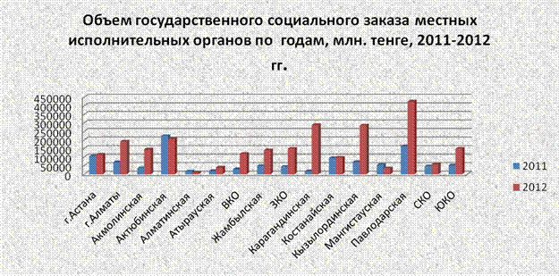 Как было отмечено выше, в общем объеме выделяемых средств на государственный социальный заказ произошел более чем двукратный рост в 2012 году по сравнению с 2011 годом. Если проанализировать предложенный график по регионам, резкий рост наблюдался во всех регионах, кроме Актюбинской, Североказахстанской, Мангистауской и Алматинской областей, городов Астаны и Алматы. В Мангистауской (с 54 млн. тенге в 2011 до 33 млн. тенге в 2012 году) и Алматинской (с 15 млн. тенге в 2011 до 9, 5 млн. тенге в 2012 году) областях даже наблюдается снижение объемов выделенных средств на реализацию государственного социального заказа. Наиболее впечатляющий рост в 2012 году произошел за счет Павлодарской, Карагандинской, Кзыл-ординской, Южно-Казахстанской, Западно-Казахстанской, Жамбылской областей. Резкое увеличение местного финансирования на реализацию государственного социального заказа в регионах объясняется активным вовлечением НПО в оказание специальных социальных услуг. Например, управление занятости и социальных программ Павлодарской области за счет государственного социального заказа привлекает НПО к оказанию следующих специальных услуг: обслуживание одиноко проживающих престарелых граждан и больных с психическими заболеваниями, оказание услуг детям и инвалидам, предоставление инвалидам специальных социальных услуг на дому и др. С 2009 года действует закон «О специальных социальных услугах» и с момента действия закона, регионы начали внедрять практику привлечения НПО к оказанию специальных социальных услуг. Как показывает международный опыт, негосударственный сектор, в частности неправительственные организации, более эффективен в оказании социальных услуг. Первым пилотным регионом в 2009 году была определена Восточно-Казахстанская область, где 8 НПО были привлечены к оказанию специальных социальных услуг на общую сумму 64, 2 млн. тенге. Как показывает практика, этот опыт оказался положительным и распространен на остальные регионы страны.