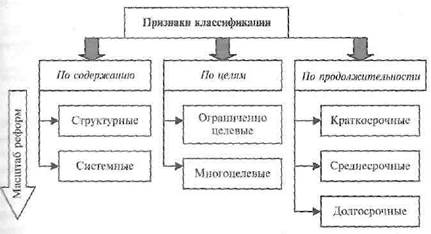 Нет необходимости доказывать, что успешность перехода экономики и общества к устойчивому развитию — доминирующей концепции мирового развития в XXI в. — в значительной степени определяется качеством построения налоговой системы и эффективностью функционирования налогового механизма страны. Достижение этих характеристик обеспечивается в результате налоговой: реформы. Определим смысловую нагрузку термина «налоговая реформа». Следует отметить, что зачастую под налоговой реформой понимают проводимые изменения налоговой системы страны, направленные на совершенствование ее отдельных элементов. Такая трактовка вряд ли приемлема. Ведь изменение отдельных элементов скорее характеризует текущий и постоянно реализуемый процесс совершенствования налоговой системы. Процессы совершенствования и реформирования налоговой системы имеют характерные различия. Во-первых, процесс совершенствования характеризуется непрерывностью: сколько времени существуют налоговые системы разных стран — столько они и совершенствуются, в отличие от реформирования — дискретного процесса, имеющего определенный: временной промежуток. Во-вторых, совершенствование характеризуется изменением отдельных элементов, в то время как отличительный признак реформы —- проведение принципиальных преобразований налоговой: системы. В-третьих, различаются движущие силы изменений. Налоговая реформа проводится при пересмотре социально-экономической политики государства и последующем кардинальном пересмотре концепции и стратегии налоговой политики, в то время как процесс совершенствования налоговой системы реализуется в контексте изменения тактики налоговой политики. В связи с этим боле адекватным нам видится следующее определение. Налоговая реформа — это ограниченный во времени комплексный процесс кардинальных преобразований налоговой системы с целью приведения ее в соответствие с новым содержанием государственной налоговой политики. История налогообложения знает достаточное количество налоговых реформ, всю совокупность которых В.Г. Пансков предложил классифицировать по трем основным признакам (рис. 6) -по содержанию, целям проведения и продолжительности.