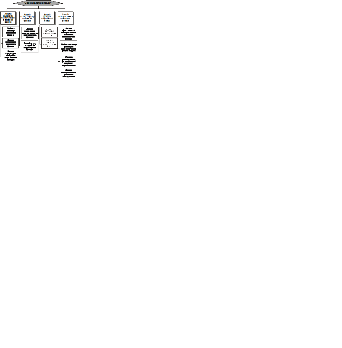 Тема 14. АНАЛІЗ ЕФЕКТИВНОСТІ ВИКОРИСТАННЯ ОСНОВНИХ ФОНДІВ ПІДПРИЄМСТВА 14.1. Значення, завдання та джерела інформації аналізу ефективності використання основних фондів підприємства 14.2. Аналіз складу, динаміки, структури і технічного стану основних фондів 14.3. Аналіз ефективності використання основних фондів 14.4. Аналіз використання обладнання та виробничої потужності підприємства 14.1. Значення, завдання та джерела інформації аналізу ефективності використання основних фондів підприємства Виробничо-господарська діяльність та фінансовий стан підприємства залежать від забезпеченості основними фондами та їх використання. Основні фонди – це матеріальні активи, які підприємство утримує для використання їх у процесі виробництва товарів і послуг, надання в оренду іншим особам або для здійснення адміністративних функцій, термін корисного використання (експлуатації) яких перевищує один рік або один операційний цикл, якщо він є тривалішим за один рік. Основними завданнями аналізу стану та ефективності використання основних виробничих фондів підприємства є: а) виявлення забезпеченості підприємства та його структурних підрозділів основними фондами, тобто встановлення відповідності величини, складу та технічного рівня фондів виробничій програмі підприємства; б) визначення рівня використання основних фондів і факторів, які на нього впливають; в) встановлення належної комплектності наявного парку обладнання; г) аналіз ефективності використання обладнання в часі і за потужністю; д) розрахунок впливу використання основних фондів на обсяг продукції; е) виявлення резервів підвищення ефективності використання основних фондів. Джерелами інформації для аналізу основних фондів підприємства є: – паспорт підприємства; – план економічного та соціального розвитку; – план технічного розвитку; – форма 1 “Баланс підприємства”; – форма 4 “Звіт про власний капітал”; – форма 1-П “Звіт підприємства (об’єднання) з продукції”; – форма 11-ОФ “Звіт про наявність та рух основних фондів, амортизацію (знос)”. – дані інвентаризацій та інвентарні картки обліку основних засобів тощо. Основні напрями аналізу використання основних фондів та послідовність його проведення показано на рис. 1.