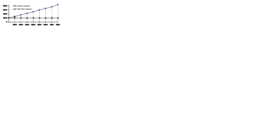Дані таблиці 3 свідчать, що загальна сума постійних витрат 1640 тис. грн. є фіксованою і не змінюється зі зростанням обсягів виробництва продукції. Проте на одиницю продукції постійні витрати змінюються обернено пропорційно зростанню обсягу виробництва. Так, випуск продукції збільшився у 8, 5 рази, а постійні витрати на одиницю продукції зменшились у 8, 5 рази. Змінні витрати в собівартості всього випуску зростають прямо пропорційно обсягу виробництва, тобто в собівартості одиниці продукції вони становлять постійну величину. Залежність загальної суми витрат від обсягу виробництва показано на рис. 1. На рисунку видно, що зі збільшенням обсягу виробництва зростає сума змінних витрат, а у випадку спаду виробництва їх рівень зменшується, наближаючись до лінії постійних витрат.