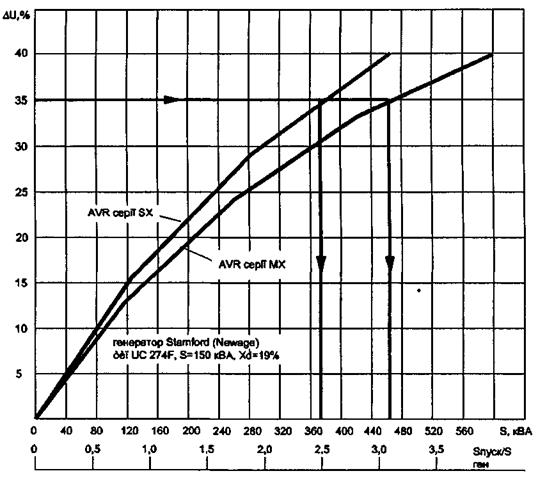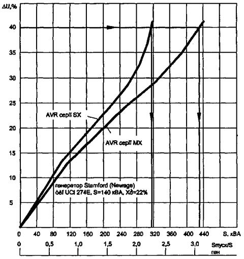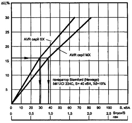 Рисунок К.3 Розрахунок за формулою (К.3) дає значення Δ Uдоп % = Sn.дв = 3 1 кВּ А для AVR серії SX; Sn.дв = 42 кВּ А для AVR серії MX. Звідси за формулою (К.2) знаходимо: Рном.дв = 4, 1 кВт для AVR серії SX; Рном дв = 5, 5 кВт для AVR серії MX. Таким чином, ДЕС потужністю 60 кВּ А забезпечить пуск двигуна ліфта тільки за умови використання AVR серії MX; б) необхідно визначити можливість пуску двигуна насосного агрегата потужністю 55 кВт станції пожежегасіння, параметри якого наведені у прикладі 1 у переліченні в) від автономної дизельної електростанції потужністю 150 кВּ А, живильна лінія виконана кабелем ВВГ 4 185 завдовжки 150 м (вибрана за моментом для нормального падіння напруги 2, 5 %). Криві генератора для даного дизель-генератора з двома найбільш розповсюдженими серіями пристроїв AVR наведені на рисунку К.4.