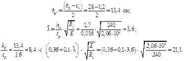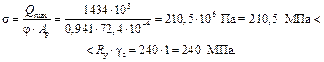 По табл. 72 [3] в зависимости от значений l x 1 = 26, 7 и Ry = 240 МПа определяется значение коэффициента продольного изгиба j = 0, 941. Проверяется устойчивость опорного ребра: