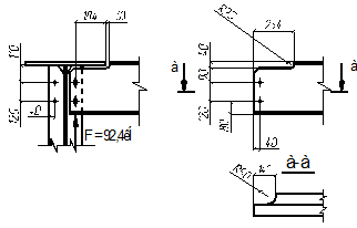 Проектирование примыкания балок настила к главной балке выполняется только при сопряжении балок в одном уровне. Принимаются болты класса точности " В" М20, класса прочности 5.6. Диаметр отверстий d = 23 мм. По табл. 58* и 59* [3] определяется расчетное сопротивление болтов срезу Rbs = 190 МПа, расчетное сопротивление смятию элементов, соединяемых болтами, Rbp = 465 МПа. Площадь болта Ab = 3, 14 см2 (табл. 62*[3]). Несущая способность односрезного болта по срезу при g b = 0, 8 принимается по табл. 35*[3]: Nbs = Rbs × g b × A × ns = 190 × 106 × 0, 8 × 3, 14 × 10-4 × 1 = 47 728 Н = =47, 73кН, где ns - число расчетных срезов одного болта. Несущая способность по смятию более тонкого элемента (стенка балки настила) равна Ndp = Rbp × g b × d × S t = 465 × 106 × 0, 8 × 0, 02 × 0, 007 = 59 520 Н = =52, 08кН, где S t – наименьшая суммарная толщина элементов, сминаемых в одном направлении (в примере, это стенка балки настила). Так как Nbs = 47, 73 кН < Nbp = 52, 08 кН, необходимое количество болтов подбирается по срезу по усилию F = Q max1 = 92, 4 кН, где Q max1 – поперечная сила балки настила на опоре (см. п. 1.2):