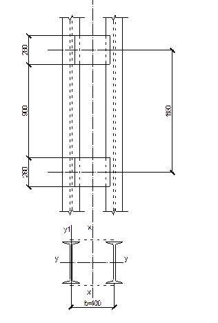 Материал конструкции – сталь С245 с расчетным сопротивлением Ry = 240 МПа (табл. 51*[3]). Расчетное значение продольного усилия сжатия в колонне: N = 2 × Q max × 1, 01 = 2 × 1434 × 1, 01 = 2897 кН. Принимается шарнирное закрепление концов колонны, тогда в соответствии с принятым характером закрепления коэффициент приведения длины m = 1. Конструктивная длина стержня колонны l к = 8, 40 м (см. п. 3.1). Расчетные длины стержня колонны: lx = ly = m × l к = 1 × 8, 40 = 8, 40 м.