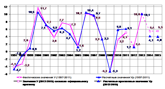 Рис. 3. Динамика темпов прироста фактических и предполагаемых значений темпов прироста ФОП ВРП (у) согласно официальному прогнозу и расчетных значений темпов прироста ФОП ВРП (ур) с использованием модели (4)