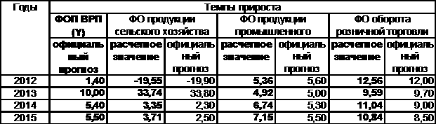 По результатам анализа сделаны следующие выводы: 1. Из рассмотренных факторов темп прироста ФОП ВРП в основном обеспечивается темпом прироста ФО оборота розничной торговли (в среднем 3, 2 % в год). 2. В среднем темпы прироста ФО продукции сельского хозяйства и промышленного производства вместе обеспечивают 1, 8 % годового прироста ФОП ВРП, однако в отдельные годы степень влияния указанных факторов может существенно варьироваться, например, при получении высокого урожая или наличия кризисных явлений. Детальное рассмотрение прогнозных индикаторов, предусмотренных «Сценарными условиями социально-экономического развития Алтайского края на 2013 год и на период до 2015 года», а также стратегических планов развития региона позволяет заключить, что в основу темпов прироста ФОП ВРП органами государственной власти Алтайского края заложено ожидание существенного снижения показателя по результатам 2012 г., связанным с низким урожаем сельскохозяйственной продукции, и динамичного роста в 2013–2015 гг., прежде всего как результата долгосрочных инвестиционных вложений в производящие секторы экономики. Учитывая фактор неопределенности развития региональной экономики, характерный для современного этапа, модель, построенную нами на основе анализа взаимосвязи показателей в ретроспективе, необходимо корректировать ежегодно, накапливая информацию об возможных изменениях закономерностей взаимосвязей и дополняя ее новыми существенными факторами. На основе модели (4) с использованием инструмента «Поиск решения» в программе Microsoft Excel рассчитаны значения темпов прироста факторных переменных для 2012− 2015 гг., при которых темпы прироста ФОП ВРП примут значения, соответствующие официальному прогнозу (табл.6). По данным таблицы 6 видим, что официально прогнозируемые значения темпов прироста ФОП ВРП на 2012− 2015 гг. достигаются с использованием модели (4) по результатам расчета факторных переменных, при этом имеются небольшие отклонения от официально прогнозируемых значений, которые объясняются отличием в методологии расчета. Похожая статья: Разработка организационно-экономического механизма функционирования регионального банковского кластера (на примере Алтайского края) Таблица 6 Результаты поиска вариантов прогнозных значений факторных переменных модели (4), при которых возможно достичь в 2012 − 2015 гг. темпов прироста ФОП ВРП на уровне официального прогноза