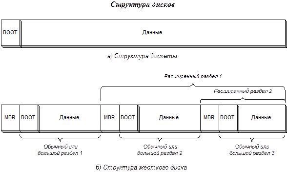 Общая структура дискет и жестких дисков различаются между собой. Эти структуры показаны на рис. 2‑ 9.