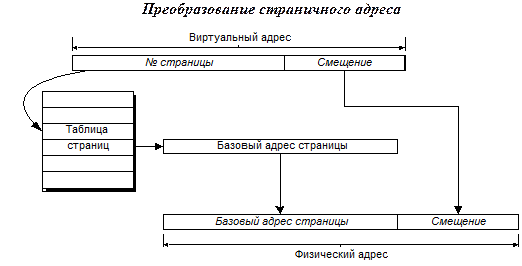 Эта форма организации виртуальной памяти во многом похожа на сегментную. Основные различия заключаются в том, что все страницы, в отличие от сегментов, имеют одинаковые размеры, а разбиение виртуального адресного пространства процесса на страницы выполняется системой автоматически. Типичный размер страницы – несколько килобайт. Для процессоров Pentium, например, страница равна 4 Кб. Все виртуальные адреса одного процесса относятся к единому линейному пространству, Проще сказать, виртуальный адрес выражается одним числом, от 0 до некоторого максимума. Старшие разряды двоичного представления этого адреса определяют номер виртуальной страницы, а младшие разряды – смещение от начала страницы. Например, для страниц по 4 Кб смещение занимает 12 младших разрядов адреса. Физическая память также считается разбитой на части, размеры которых совпадают с размером виртуальной страницы. Эти части называются физическими страницами или страничными кадрами (page frames). Таблица страниц процесса по структуре похожа на таблицу сегментов. Для каждой виртуальной страницы она содержит режим доступа, флаг присутствия страницы в памяти, номер страничного кадра, флаг чистоты. Если страница отсутствует в памяти, ее данные сохраняются в файле подкачки, который в этом случае чаще называют страничным файлом (page file). Простейший вариант схемы преобразования виртуального страничного адреса в физический адрес показан на рис. 5‑ 3.