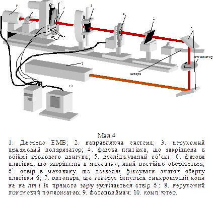 Мета роботи Керувати дослідно-експериментальною установкою за допомогою комп'ютера, отримати експериментальні дані та провадити їх обробку. Прилади: Персональний комп'ютер, кроковий рушій, плата з двоканальним АЦП, Мюллер-поляриметр. Теоретичні відомості Бурхливий розвиток та постійне вдосконалення техніки сьогодні призвели до того, що людина отримала можливість отримувати та обробляти таку кількість різноманітних даних, про яку не могла мріяти ще 60 років назад. Людина намагається взяти під контроль такі сили та об‘єми інформації, які знаходяться в межах простору та часу, які виходять за рамки можливостей органів відчуттів людини, як біологічної істоти. Дедалі частіше виникають ситуації, коли проведення експерименту спряжене з необхідністю обробляти велику кількість інформації, та швидко і точно змінювати велику кількість параметрів. Спроба людини вирішити цю задачу без залучення сучасної приречена на невдачу (якщо не мається на увазі теоретична робота, яка зараз часто теж стає неможливою без залучення техніки). З метою розширення своїх можливостей в області експерименту, людство почало створювати пристрої, які можуть швидко обробляти та записувати великі масиви даних, та швидко заданим людиною чином змінювати умови та параметри експерименту. Прикладом такого пристрою (системи) є КАМАК або КЗК (каналу загального користування). Як відомо, як перший так і другий призначені для надання експериментатору можливості автоматично керувати приладами, що використовуються в експерименті (сумісними з даними стандартами), вводити та обробляти отриману таким чином інформацію в ЕОМ з максимальним використанням швидкісних та точнісних можливостей останньої. В даній лабораторній роботі необхідно буде організувати автоматизоване зчитування сигналу, що формується в приймальному каналі лабораторного поляриметра, а також здійснювати автоматизоване керування відповідними вузлами поляриметра за заданою програмою. Детальна схема поляриметра приведена нижче. Отже сигнал від джерела випромінювання (ЕМВ) 1 по системам дзеркал 2 потрапляє в робочий канал поляриметра. За допомогою призмового поляризатора 3 ЕМВ набуває лінійної поляризації з цілком певним азимутом орієнтації. Після призмового поляризатора випромінювання потрапляє на фазову платівку 4, орієнтацію якої можна змінювати, перетворюючи таким чином лінійну поляризацію ЕМВ на поляризацію з заданими еліптичностями та азимутами. Далі, в загальному випадку, може бути розміщений досліджуваний об‘єкт 5, що вносить свою зміну в стан поляризації ЕМВ, але зараз нас не буде цікавити природа зміни поляризації. Далі поляризований сигнал потрапляє в приймальну частину поляриметра, що складається: § з фазової платівки 6, яка, неперервно обертаючись, здійснює поляризаційну модуляцію ЕМВ за періодичним законом. Фазова платівка закріплена в маховику, з краю якого є отвір 6‘; маховик, періодично обертаючись, в певні моменти часу приймає таке положення, при якому отвір на його краю потрапляє в поле зору оптронної пари 7, в цей час сигнал з світлодіоду через отвір в лімбі потрапляє на фотодіод (оптронної пари), який реєструє останній, видаючи сигнал на своєму виході, прив‘язуючись до якого можна відраховувати періоди обертання платівки 6; § промодульований по поляризації сигнал потра