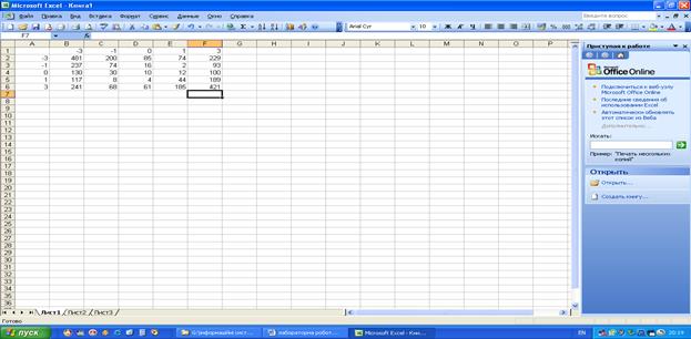 В ячейках А2: А6 и B1: F1 введены значения х и у соответственно. В ячейку В2 введена формула =($A2^2+B$1^2-3)^2+(2*$A2+3*B$1-1)^2, вычисляющая правую часть уравнения при значении х и у из ячеек А2 и В1 соответственно. Протащим эту формулу на диапазон В2: F6. Из рисунка видно, что за начальное приближение к корню целесообразней выбрать следующие пары значений (-1; 1), (1; 0), (1; -1). Можно убедится что две последние пары начальных приближений с помощью средства поиска решений будут приводить к одному и тому же решению. Для нахождения первого корня отведем под применением х и у ячейки А10 и В10, соответственно, и введем в них начальные приближения -1 и 1. В ячейку С10 введем формулу: =(A10^2+B10^2-3)^2+(2*A10+3*B10-1)^2 Затем вызываем команду Сервис. Поиск решений и заполняем открывшееся диалоговое окно. После нажатия на кнопку Выполнить средство поиска решения находит решение. Аналогично находится и второе решение. Решениями будут значения 1, 576 и -0, 717. Убедитесь, что начальное приближение (1; -1) приводит к тому же результату, что и приближение (1; 0).