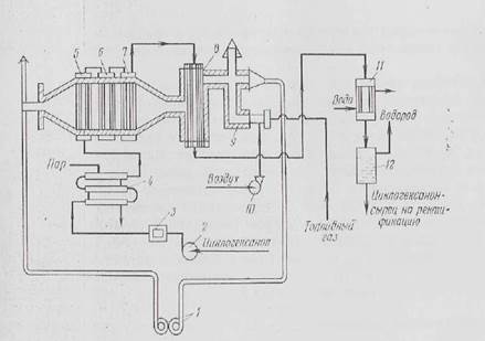 Циклогексанол-сырец подвергают ректификации, а водород после очистки используют для гидрирования фенола в циклогексанол. Для обогрева контактной системы в нижней части топки 9 сжигают топливный газ (метан). Для поддержания температуры топочного газа, равной 500-550 °С, его смешивают с возвратным топочным газом из борова. Газ, имеющий такую температуру, проходит в межтрубном пространстве контактного аппарата прямотоком к парам циклогексанола, движущимся по трубкам с катализатором. Топочные газы, выходящие из контактного аппарата при 430-480 °С, используются для обогрева испарительно-перегревательной системы (аппараты 5, 6 и 7). Далее часть топочных газов, имеющих температуру 340-300 °С, выпускают в атмосферу, а остальной газ с помощью ротационной газодувки 1 подают на смешение с продуктами сгорания топливного газа в верхнюю часть топки 9.