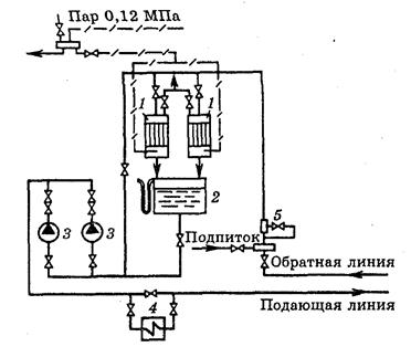 Рис. 7.2. Принципиальная схема двухступенчатой поверхностной пароводяной подогревательной установки 1 - пиковый подогреватель; 2 - основной подогреватель; 3 - сетевой насос; 4 - конденсатный насос; 5 - охладитель конденсата; 6 - грязевик; 7 - водомер; 8 - подпиточный насос; 9 - регулятор подпитки