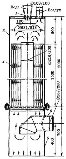 Рис. 7.5. Пленочный подогреватель ляющиеся из воды в процессе ее подогрева, отводятся наружу через дренажную трубу. На рис. 7.6 приведены результаты проведенного Всесоюзным теплотехническим институтом испытания пленочного подогревателя [101]. Данные испытания относятся к подогревателю с площадью поверхности нагрева 30 м. Расход воды через подогреватель во время испытания составлял 5, 5 кг/с. Коэффициент теплопередачи, Вт/(м • К), определялся по формуле