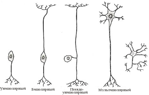 Существует несколько типов классификации нейронов. По строению нейроны делят на три типа: униполярные, биполярные и мультиполярные.