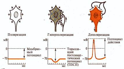 Рис. Возможные состояния нейрона (покой, торможение, возбуждение)