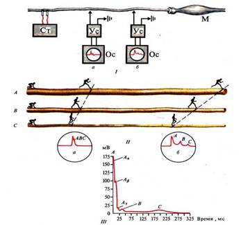 Рис. Проведение возбуждения в нервных волокнах (по Дж. Бендоллу, 1970)