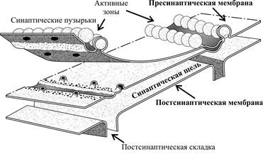 Химические синапсы. В качестве примера можно рассмотреть аксо-соматический химический синапс. Аксон, подходя к телу другого нейрона, образует расширение, называемое пресинаптическим окончанием, или терминалью. Размеры пресинаптического окончания варьируют в диапазоне 0, 75 – 1, 5 мкм. Мембрана такого окончания называется пресинаптической. Под ней располагается синаптическая щель, ширина которой составляет 10 – 50 нм, а в нервно-мышечном синапсе 50 – 100 нм (для сравнения - расстояние между мембранами вне зоны их синаптического контакта не превышает 10 – 15 нм). Содержимое синаптической щели напоминает гель. За синаптической щелью находится мембрана тела нейрона, которая в области синапса называется постсинаптической. В составе постисинаптической мембраны обычно выделяют субсинаптическую мембрану, расположенную в проекции пресинаптических структур. Субсинаптическая мембрана существенно отличается от остальных участков субсинаптической мембраны: она не содержит потенциалзависимых ионных каналов, а содержит только хемиозависимые ионные каналы (лигандчувствительные), открывающиеся под действием нейромедиатора. Наконец, на субсинаптической мембране может находиться специальный фермент, расщепляющий нейромедиатор, что способствует освобождению постсинаптического рецептора.