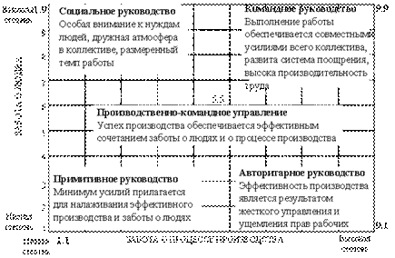 Рис.17. Модель Блейка – Мутона 1.1. – нищета управления (примитивное руководство). Со стороны руководителя требуется лишь минимальное усилие, чтобы добиться такого качества работы, которое позволит избежать увольнения. Эта позиция характеризует такой тип руководителя, который достаточно холодно относится как к своим подчиненным, так и к самому процессу производства. 1.9. – клубное управление (социальное руководство). Руководитель сосредоточивается на хороших, теплых человеческих взаимоотношениях, но мало заботится об эффективности выполнения заданий. Эта позиция характеризует руководителей, которые уделяют особое внимание нуждам и потребностям своих подчиненных, чего нельзя сказать о процессе производства. 9.1. – авторитет – подчинение. Руководитель очень заботится об эффективности выполняемой работы, но обращает мало внимания на моральный настрой подчиненных. Эта позиция характерна для менеджеров, которые во главу угла ставят заботу о производстве и практически не осуществляют никакой социальной деятельности. 5.5. – организация (производственно-социальное управление). Руководитель достигает приемлемого качества выполнения заданий, находя баланс эффективности и хорошего морального настроя. Эта позиция характеризует тот тип руководителя, который умело сочетает заботу о людях с заботой о производстве. 9.9. – команда. Благодаря усиленному вниманию к подчиненным и эффективности, руководитель добивается того, что подчиненные сознательно приобщаются к целям организации. Это обеспечивает и высокий моральный настрой, и высокую производительность. Эта позиция характеризует такой тип руководителя, который одинаково бережно относится как к людям, так и к возглавляемому им производству. Блэйк и Мутон исходили из того, что самым эффективным стилем руководства – оптимальным стилем – было поведение руководителя в позиции 9.9. По их мнению, такой руководитель сочетает в себе высокую степень внимания к своим подчиненным и такое же внимание к производительности. Они также поняли, что есть множество видов деятельности, где трудно четко и однозначно выявить стиль руководства, но считали, что профессиональная подготовка и сознательное отношение к целям позволяет всем руководителям приближаться к стилю 9.9, тем самым, повышая эффективность своей работы. Успех стиля управления можно оценивать по критериям: Эффективность стилей управления нельзя оценивать вне конкретных ситуаций. При этом следует учитывать: Поведение менеджера должно соответствовать ситуации, гибкость стиля является важным признаком качества менеджера. Следует не только менять стиль управления, но и создавать соответственные ситуационные условия (формировать ситуацию через подбор кадров, изменять оргструктуры и организацию труда). Специфика работы менеджера заключается в постоянном общении с деловыми партнерами, подчиненными, клиентами. Поэтому одной из важнейших задач менеджера является умение научиться оставлять о себе хорошее впечатление, т. е. научиться формировать хороший имидж, под которым понимается формируемый в глазах общества комплекс его внешних и внутренних качеств. Положительный имидж всегда способствует карьерному продвижению менеджера.