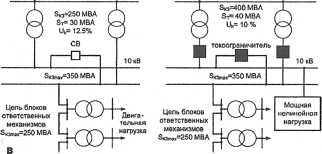 Рис. 32.1 Применение ТО на подстанциях в цепях выключателей высокого напряжения (ВН) позволяет скоординировать растущий уровень токов КЗ в сетях ВН с отключающей способностью выключателей, отработавших свой срок или подлежащих замене. При применении ТО может быть решена и проблема токоограничения при одновременном соблюдении требований по самозапуску двигателей в цепях собственных нужд электростанций и подстанций, на промышленных предприятиях со сложными непрерывными технологическими процессами. При этом могут быть улучшены оба параметра, влияющие на самозапуск двигателей: увеличено напряжение на шинах с подключенными двигателями, которое прикладывается к ним после отключения КЗ, и уменьшена длительность посадки напряжении при КЗ за счет сокращения времени АВР и, соответственно, уменьшения времени торможения двигателей. Первый эффект обеспечивается за счет свойства ТО иметь низкий реактанс в нормальном режиме. Уменьшение времени АВР может быть достигнуто за счет установки ТО в цепь секционного выключателя. Такая схема позволяет держать секционный выключатель нормально замкнутым, не боясь увеличения тока короткого замыкания. При этом время работы с пониженным напряжением определится только временем отключения поврежденного присоединения или ввода питания. Снижение же напряжения на той секции, где нет КЗ вообще, практически не произойдет. Возможность работы секционированного распределительного устройства (РУ) с нормально замкнутым секционным выключателем позволяет, кроме того, равномерно распределить нагрузку между питающими трансформаторами, что ведет к снижению потерь. Последнее относится не только к цепям собственных нужд, но и к любым распределительным и питающим сетям. В случае установки в рассматриваемых цепях бетонных реакторов, реактанс которых выбирается по уровню токоограничения, напряжение за ними после ликвидации КЗ может оказаться недостаточным для самозапуска двигателей. Исходя из этих соображений, в ряде случаев приходится отказываться от установки токоограничивающих реакторов, завышая при этом коммутационную способность выключателей и удорожая тем самым стоимость распределительных устройств. По данным специалистов ФСК ЕЭС, уже в настоящее время на целом ряде подстанций московской энергосистемы токи КЗ приближены к предельным значениям, не позволяющим увеличить нагрузку данных подстанций при реконструкции и сооружении новых линий связи с вводимыми генерирующими источниками. Эффективность применения ТО в электрических сетях определяется следующими факторами: - сохранением существующего на станциях и подстанциях коммутационного оборудования при подключении дополнительных мощностей или подключении новых линий; - снижением затрат на коммутационное оборудование на вновь строящихся объектах; - отказом от секционирования электрических сетей 110 – 500 кВ, обеспечивающим повышение надежности работы системы; - повышением надежности питания промышленных предприятий; - повышением качества электроэнергии за счет уменьшения эквивалентного индуктивного сопротивления сети; - повышением надежности работы электрооборудования за счет снижения электродинамических и тепловых воздействий при ограничениях ударных и установившихся токов КЗ; - упрощением схем электроснабжения за счет 