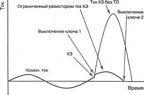 Рис. 32.3 1 – без устройства ТО; 2 – с ТО- выключателем Функцию быстродействующего токоограничителя-выключателя выполняет ППТО (вариант 8 на рис. 2). При превышении мгновенного значения тока в основном полупроводниковом ключе 1 выше заданного уровня подается сигнал на его закрытие, ток переходит токоограничивающую цепь с ключом 2, который гаснет при переходе тока через ноль. На рис. 4 представлена расчетная осциллограмма отключения тока КЗ таким ТО.