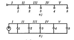 Рнс. 3. Схема тепловой сети а — однолинейное изображение; б — двухлинейное изображение Участки магистрали нумеруются римскими цифрами, а ответвления к абонентам и абоненты — арабскими. Суммарный расход воды в сети обозначим буквой V без индекса. Расход воды через абонентскую систему — буквой V с индексом, равным номеру абонента. Например, Vm— расход воды через абонентскую систему m. Относительный расход воды через абонентскую систему, т.е. отношение расхода через абонентскую систему к суммарному расходу воды в сети, обозначим V с индексом. Например, относительный расход воды у абонента Расход воды у абонента 1 может быть найден из уравнения