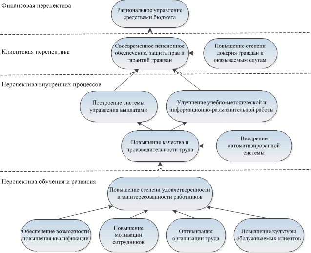 Оценка всех возможных вариантов стратегий дальнейшего развития Отдела ПФП выявила, что наибольшей привлекательностью обладает стратегия, связанная с повышением производительности труда за счёт разработки информационной системы, повышения качества взаимоотношений с гражданами (стратегия Е). Данное направление развития предполагается реализовать путём разработки автоматизированной системы управления компенсационными выплатами и последующего внедрения её в структурных подразделениях учреждения. Важно отметить, что выбор альтернативных вариантов развития происходил в условиях неопределённости, при которых исходной информации недостаточно для определения численных значений целевой функции по каждому из сравниваемых вариантов. К условиям неопределённости относятся неопределённость целей, а также условий и последствий решения проблем. Выбор того или иного варианта развития в условиях неопределённости включает в себя два этапа: построение матрицы эффектов и ущерба и матрицы риска и количественную оценку вариантов. Каждая строка матрицы соответствует одному из вариантов намеченных решений – Для каждой пары Количественной оценкой риска для каждого Матрица эффектов и ущерба и матрица риска от применения выделенных стратегий развития предприятия в условиях той или иной ситуации представлены в прил. 11. Значения целевой функции Для оценки матрицы эффектов и ущерба и матрицы риска использованы следующие стратегии выбора альтернатив. Стратегия наибольшего гарантированного эффекта. Для реализации этой стратегии в каждой строке матрицы эффектов и ущерба выбирается минимальный эффект – Стратегия наименьшего возможного риска. Она ориентируется на худшую ситуацию, сопряжённую с наибольшим риском. В этом случае по каждой строке матрицы риска выбирается максимальный риск – В соответствии с полученными результатами оценки основных стратегий развития разрабатывается система целей учреждения. Однако перед тем как приступить к изучению и анализу целей, необходимо произвести визуализацию выбранной стратегии развития посредством построения стратегической карты, которая позволит представить в формализованном виде основные стратегические цели предприятия и установить причинно-следственные связи между ними. При этом стратегические цели условно сгруппированы по четырём направлениям: финансовая перспектива, клиентская перспектива, процессная перспектива и перспектива обучения и развития. Стратегическая карта для исследуемого Отдела Пенсионного фонда РФ представлена на рис. 1.9.