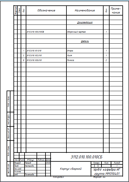 Наименование сварного узла в задании - «Корпус сварной». Детали, из которых состоит сварной узел, - Опора, Лист и Полоса (2 детали). По указанным в задании сварным швам определены контуры сварного узла на чертеже изделия. По приведенным в задании описаниям составлены стандартные обозначения сварных швов.