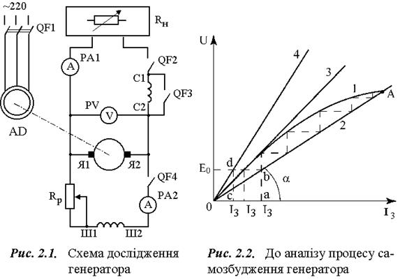 МЕТОДИЧНІ ВКАЗІВКИ На робочому місці №1 знаходяться: · машинний агрегат, що складається з двох електричних машин: машини постійного струму та трифазного асинхронного двигуна з короткозамкненим ротором, вали яких з’єднані за допомогою муфти; · регулювальні реостати для кола збудження і кола якоря та навантажувальний реостат; · електровимірювальні прилади. Генератор постійного струму має дві обмотки збудження – паралельну Ш1 – Ш2 і послідовну С1 – С2. У даній роботі використовуються дві обмотки збудження, на які живлення подається не від стороннього джерела електроенергії, а від кола якоря машини, тому генератор називається із самозбудженням. Трифазна обмотка статора асинхронного двигуна з’єднується в трикутник і на неї подається живлення з мережі змінного струму з лінійною напругою 220 В. Електровимірювальні прилади, навантажувальні та регулювальні реостати вибирають згідно з номінальними даними дослідного генератора з урахуванням меж регулювання струму та напруги під час проведення дослідів. Реостати і амперметри для кола якоря повинні бути розраховані на струм Ір = (1.1...1.2) Ін, а для кола паралельної обмотки збудження – на струм Ізр = (0.05…0.1) Ін. Перевірку самозбудження генератора виконують за схемою, зображеною на рис.2.1, у такій послідовності. Асинхронним двигуном приводять у рух якір генератора з номінальною частотою обертання (напрямок обертання показує стрілка на корпусі генератора), коли вимикачі (QF2 і QF4) розімкнені. Для самозбудження генератора мають виконуватись три умови. 1. У магнітному колі генератора повинен мати місце потік залишкового магнетизму Фо, величина якого становить 2 – 4 % від номінального Фн. Під час обертання якоря генератора в полі залишкового магнетизму в його обмотці індукується ЕРС Ео, яку показує вольтметр. Якщо ЕРС якоря дорівнює нулю, то потік залишкового магнетизму відсутній. Для створення Фо паралельну обмотку збудження Ш1 – Ш2 підключають до джерела постійного струму і короткочасно (впродовж кількох секунд) пропускають струм збудження величиною (0, 05…0, 1) Ін. 2. Приєднання паралельної обмотки збудження до якоря повинно бути узгодженим. Якщо обмотка збудження підключена узгоджено, то під час замикання вимикача QF4 покази вольтметра мають дещо збільшуватись (величина опору Rр у колі обмотки збудження повинна бути максимальною). Це свідчить про те, що МРС обмотки збудження збігається за напрямком з потоком залишкового магнетизму; таким чином, основний магнітний потік генератора і ЕРС обмотки якоря збільшуватимуться. У разі неузгодженого підключення обмотки збудження в момент замикання вимикача QF4 покази вольтметра дещо зменшуються. У цьому випадку необхідно змінити напрямок струму в обмотці збудження на протилежний (в електричній схемі провідники на затискачах Ш1 і Ш2 міняють місцями). 3. Величина опору в колі паралельної обмотки збудження повинна бути меншою від критичної. Для аналізу цієї умови доцільно розглянути рис. 2.2, де наведені вольт-амперні характеристики генератора – це х.х.х. (крива 1) та вольт-амперні характеристики кола паралельної обмотки збудження за трьох різних фіксованих значень опору Rр (прямі 2, 3, 4). Кут a нахилу вольт-амперної характеристики залежить від величини загального опору кола збудження R3, оскільки tga = де Rоз – опір паралельної обмотки збудження. Якщо величи