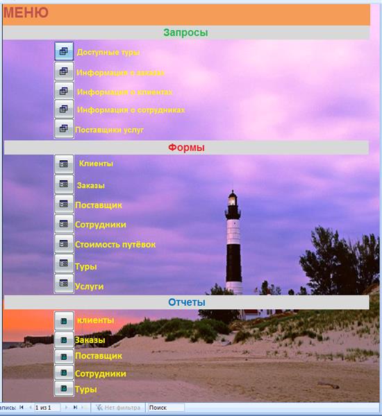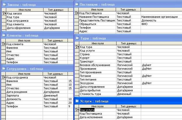 В даному курсовому проекті як предметна область розглядається туристична фірма. Наша база даних вирішує наступні завдання: облік замовлень, подання даних про доступні тури, співробітників, клієнтів і про постачальників послуг. У режимі форм створено кнопкове меню. З його допомогою можна швидко отримати доступ до даних про співробітників, клієнтів, замовлення, тури, постачальників послуг, вартості путівок і послуги. Здійснені запити з пошуку відомостей про доступні тури, клієнти, співробітники, постачальники послуг, замовлення, послуги. Також проводиться процедура націнки вартості на путівки на 20% та збільшення заробітної плати співробітників на 5%. Застосовувана СУБД: ACCESS 2007. Викладемо дані про туристичну фірму. У фірми є постачальники (які співпрацюють з фірмою), які здійснюють надання певних послуг (перевезення пасажирів, забезпечення їх тимчасовим житлом, допомога з оформленням віз і т.д.). Також у фірмі є свій штат працівників: менеджери і консультанти, які здійснюють продаж путівок, бухгалтер, охоронець і прибиральник. Завдання курсової роботи такі: - Набуття вміння вибирати варіанти проектування БД і відповідні інструментальні засоби; - Закріплення навичок роботи з сучасними СУБД; - Закріплення навичок проектування логічної моделі інформаційної системи за допомогою сучаних CASE-засобів; - Набуття навичок складання інструкції користувача до автоматизованої інформаційної системи. Потрібно створити автоматизовану інформаційну систему (далі – АІС) для представництва туристичної фірми за кордоном.
