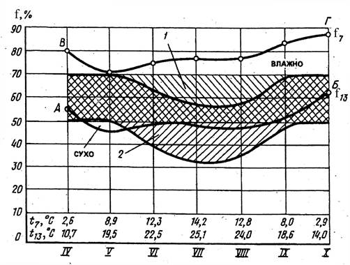 Численное значение относительной влажности показывает близость среды к насыщенному влажностью состоянию и, тем самым характеризует возможность терморегуляции человеческого организма. Воздействие влажности воздуха на человека как указывалось, связано с температурой воздуха. Характер этой взаимосвязи показан на графике рис.2.2.2. На графике даны верхние и нижние критические значения j, ограничивающие зону оптимальных значений j. Внутри этой зоны показана зона наиболее комфортных значений t и j. Вне оптимальной зоны j определены области дискомфорта по температуре и влажности. Для оценки температурно-влажностного режима строится рабочий график рис.2.5.1. Горизонтальная ось разбивается на равные отрезки, соответствующие месяцам года с положительной температурой. По вертикальной оси отмечается масштаб относительной влажности j. Делается построение критических значений относительной влажности воздуха j для каждого месяца. Для этого узнается средняя температура для каждого месяца по климатическим данным и по графику рис.2 для каждой температуры находится критические верхние и нижние значения j, которые откладываются на рабочем графике для каждого соответствующего месяца. Критические значения j на рабочем графике ограничивают зону оптимальной влажности в данной местности при положительных температурах. Здесь же строится кривая, показывающая сезонный ход изменения фактической относительной влажности j. Очевидно, если фактическая кривая j выйдет за пределы оптимальной зоны, то это означает, либо повышенную влажность воздуха (кривая j идет поверх зоны), либо сухость воздуха (кривая j идет внизу зоны). Точно такое же построение можно проделать и для оценки температурно-влажностного режима в утренние (ночные) часы. Последнее рекомендуется сделать в условиях континентального климата. После построения рабочего графика делается вывод: о том, какое по температуре и влажности лето в данной местности, например: сухое жаркое лето, холодное влажное и т.п.