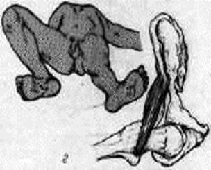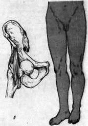 Очень часто в этот момент слышен щелкающий звук. Передние вывихи бедра. Возникают вследствие непрямого механизма травмы, основными формирующими условиями которого являются: наружная ротация конечности, отведение и последующая значительная нагрузка по ее оси. Чаще всего подобная ситуация возникает при падении пострадавшего с высоты и приземления на ноги. Помимо выраженной боли и полного нарушения функции конечности для передних вывихов (запирательного и надлонного) характерны резкое отведение нижней конечности, ротация кнаружи, кажущееся удлинение конечности (рис.16в, г).