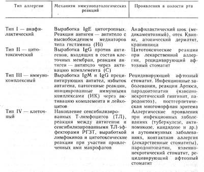 В полости рта встречаются все варианты иммунной патологии. Аллергические реакции генерализованного I (анафилактического) и II (цитотоксического) типа обнаруживаются в случаях медикаментозной аллергии. Они нередко встречаются в хирургической стоматологии при местном обезболивании новокаином. Наиболее опасной формой аллергической реакции I типа является отек Квинке, распространяющийся на гортань и грозящий удушьем. Механизм заболевания связан с реакцией антиген — антитело, которая происходит на мембране тучных клеток с участием гомоцитотропных антител класса IgE и сопровождается массивным выбросом гистамина и гистаминоподобных веществ в кровь. Аллергические реакции III типа (иммунокомплексного) на слизистой оболочке рта связаны с образованием иммунных комплексов. Они могут быть вызваны либо бактериальными, либо медикаментозными антигенами. Данные реакции могут наблюдаться при пародонтозе, язвенно-некротическом гингивите, постгерпетической многоморфной эритеме. Они приводят к некрозу, возникающему в результате повреждения сосудистой стенки иммунными комплексами, которые образуются внутри сосудов и оседают на базальной мембране. Так, например, при язвенно-некротическом гингивите плазматические клетки соединительной ткани десен вырабатывают антитела классов IgG и IgM, которые образуют иммунные комплексы с поступающими микробными антигенами. Это приводит к активации системы комплемента по классическому пути и вызывает иммунные повреждения типа феномена Артюса, которые проявляются в поверхностном васкулите, тромбозе и некрозе. Аллергические реакции IV типа (клеточного) в полости рта возникают под воздействием инфекционных агентов. Классическим примером подобных воздействий является развитие инфекционной аллергии при туберкулезе. РГЗТ развивается также и при многих других инфекциях, а также при контактном дерматите и лекарственных стоматитах. Часто наблюдаемые лекарственные стоматиты связаны с широким применением в стоматологии акриловых смол, мышьяка, риванола, рентгеноконтрастных веществ и антибиотиков. С помощью кожно-аллергических проб показано, что чужеродные вещества, из которых изготавливают протезы, вызывают аллергизацию в 0, 5 — 5 % случаях. В ранних стадиях язвенного гингивита преобладает иммунное воспаление клеточного характера при участи и сенсибилизированных Т-лимфоцитов и привлеченных лимфокинами макрофагов.