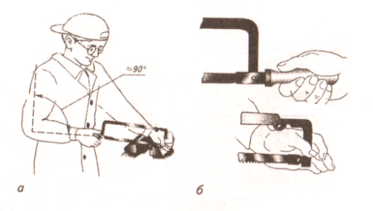 При резке ручной ножовкой становятся перед тисками прямо, свободно и устойчиво, в пол оборота по отношению к губкам тисков или оси обрабатываемой заготовки. Ступни ног ставят так, чтобы образовали угол 60...70 градусов при определённом расстоянии между пятками. Положение рук (хватка). Рукоятку обхватывают четырьмя пальцами правой руки так, чтобы она упиралась в ладонь; большой палец накладывают сверху вдоль рукоятки. Пальцы правой руки обхватывают гайку и подвижную головку ножовки. Работа ножовкой. При резке ножовкой, как и при опиливании, должна соблюдаться строгая координация усилий (балансировка), заключающаяся в правильном увеличении нажима рук. В процессе резки осуществляется два хода - рабочий, когда ножовка перемещается вперёд от работающего, и холостой, когда к работающему. При холостом ходе на ножовку не нажимают, в результате чего зубья только скользят, а при рабочем ходе обеими руками создают лёгкий нажим так, чтобы ножовка двигалась прямолинейно. При работе ножовкой необходимо выполнять следующие правила: в работе должно участвовать всё ножовочное полотно; при резке не давать полотну нагреваться; для уменьшения трения полотна о стенки в пропиле заготовки периодически смазывать полотно минеральным маслом или графитовой смазкой, особенно при резке вязких металлов; латунь и бронзу разрезать только новыми полотнами, так как даже малоизношенные зубья не режут, а скользят; в случае поломки или выкрашивания хотя бы одного зуба работу немедленно прекратить, удалить из пропила остатки сломанного зуба, полотно заменить новым или сточить на станке два - три соседних зуба; после этого можно продолжить работу. Резка ножовкой круглого, квадратного, полосового и листового металла. Резка круглого металла.