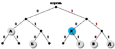 8) таким образом, расстояние Хэмминга, равное 3, сохраняется только для ответа 2 9) Ответ: 2. Ещё пример задания: Р-06. Для кодирования некоторой последовательности, состоящей из букв А, Б, В, Г и Д, используется неравномерный двоичный код, позволяющий однозначно декодировать полученную двоичную последовательность. Вот этот код: А–00, Б–010, В–011, Г–101, Д–111. Можно ли сократить для одной из букв длину кодового слова так, чтобы код по-прежнему можно было декодировать однозначно? Коды остальных букв меняться не должны. Выберите правильный вариант ответа. 1) для буквы Б – 01 2) это невозможно 3) для буквы В – 01 4) для буквы Г – 01 Решение (1 способ, проверка условий Фано): 1) для однозначного декодирования достаточно, чтобы выполнялось условие Фано или обратное условие Фано; 2) проверяем последовательно варианты 1, 3 и 4; если ни один из них не подойдет, придется выбрать вариант 2 («это невозможно»); 3) проверяем вариант 1: А–00, Б–01, В–011, Г–101, Д–111. «прямое» условие Фано не выполняется (код буквы Б совпадает с началом кода буквы В); «обратное» условие Фано не выполняется (код буквы Б совпадает с окончанием кода буквы Г); поэтому этот вариант не подходит; 4) проверяем вариант 3: А–00, Б–010, В–01, Г–101, Д–111. «прямое» условие Фано не выполняется (код буквы В совпадает с началом кода буквы Б); «обратное» условие Фано не выполняется (код буквы В совпадает с окончанием кода буквы Г); поэтому этот вариант не подходит; 5) проверяем вариант 4: А–00, Б–010, В–011, Г–01, Д–111. «прямое» условие Фано не выполняется (код буквы Г совпадает с началом кодов букв Б и В); но «обратное» условие Фано выполняется (код буквы Г не совпадает с окончанием кодов остальных буквы); поэтому этот вариант подходит; 6) правильный ответ – 4. Решение (2 способ, дерево): 1) построим двоичное дерево, в котором от каждого узла отходит две ветки, соответствующие выбору следующей цифры кода – 0 или 1; разместим на этом дереве буквы А, Б, В, Г и Д так, чтобы их код получался как последовательность чисел на рёбрах, составляющих путь от корня до данной буквы (красным цветом выделен код буквы В – 011):