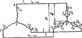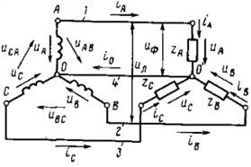 Ответ: С хема «звезда с нулевым проводом». При соединении фазных обмоток источника трехфазного тока (например, генератора) по схеме «звезда с нулевым проводом» концы его трех обмоток соединяют в общий узел 0, который называется нулевой точкой, или нейтралью источника (рис. 206). Приемники электрической энергии объединяют в три группы ZA, ZB и Zc (фазы нагрузки), концы которых также соединяют в общий узел 0′ (нулевая точка, или нейтраль нагрузки). Обмотки источника соединяют с фазами нагрузки четырьмя проводами. Провода 1, 2 и 3, присоединенные к началам фазных обмоток (А, В, С), называют линейными. Провод 4, соединяющий нулевые точки 0 и 0′, называют нулевым, или нейтральным. Напряжения uА, uв и uс между началами и концами обмоток отдельных фаз источника или фаз нагрузки ZA, ZB и Zc называют фазными. Они равны также напряжениям между каждым из линейных проводов и нулевым проводом. При отсутствии потери напряжения в обмотках источника (при холостом ходе) фазные напряжения равны соответствующим э. д. с. в этих обмотках. Фазными токами iA, iB, ic называют токи, протекающие по обмоткам источника или фазам нагрузки ZA, ZB и Zc. Напряжения uAB, uBC, uCA между линейными проводами и токи, проходящие по этим проводам, называют линейными. Примем условно за положительное направление токов iA, iB и ic в фазах источника — от конца соответствующей фазы к ее началу,