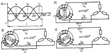 Ответ: При равномерной или симметричной нагрузке всех трех фаз, когда во всех фазах включены одинаковые активные и реактивные сопротивления (RA =RB = RCи ХA=ХВ=ХС), фазные токи iA, iB и iC будут равны по величине и сдвинуты от соответствующих фазных напряжений на равные углы. В этом случае получаем симметричную систему токов, при которой токи iA, iB, iC будут сдвинуты по фазе друг относительно друга на угол 120°, а ток i0 в нулевом проводе в любой момент времени равен нулю (рис. 208, б). Очевидно, что при равномерной нагрузке можно удалить нулевой провод и передавать электрическую энергию источника к приемнику по трем линейным проводам 1, 2 и 3 (рис. 209). Такая схема называется «звезда без нулевого провода». При трехпровод-ной системе передачи электрической энергии в каждое мгновение ток по одному (или двум) проводу проходит от источника трехфазного тока к приемнику, а по двум другим (или одному) протекает обратно от приемника к источнику (рис. 210). Векторная диаграмма напряжений для схемы «звезда без нулевого провода» при равномерной нагрузке фаз будет такая же, как и для схемы «звезда с нулевым проводом» (см. рис. 207). Такими же будут и соотношения между фазными и линейными токами и напряжениями: Iл= IФ и Uл=? 3 UФ. Следует отметить, что схема «звезда без нулевого провода» может быть применена только при равномерной нагрузке фаз. Практически это имеет место лишь при подключении к источникам трехфазного тока электрических двигателей, так как каждый трехфазный электродвигатель снабжен тремя одинаковыми обмотками, которые равномерно нагружают все три фазы. При неравномерной нагрузке напряжения на отдельных фазах нагрузки будут различными. На некоторых фазах (с меньшим сопротивлением) напряжение уменьшится, а на других увеличится по сравнению с нормальным, что является недопустимым.