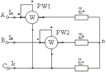 Ответ: В трехпроводных трехфазных цепях при симметричной и несимметричной нагрузках и любом способе соединения приемников широко распространена схема измерения активной мощности приемника двумя ваттметрами (рис. 3.21). Показания двух ваттметров при определенной схеме их включения позволяют определить активную мощность трехфазного приемника, включенного в цепь с симметричным напряжением источника питания. На рис. 3.21 показана одна из возможных схем включения ваттметров: здесь токовые катушки включены в линейные провода с токами IA и IB, а катушки напряжения – соответственно на линейные напряжения UAC и UBC.
