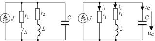где p1 и p2 - корни характеристического уравнения. Поиск решения выполняется в той же последовательности, что и для цепей первого порядка: 1. Находят корни характеристического уравнения. Они могут быть вещественными разными и отрицательными или вещественными кратными и отрицательными или комплексно-сопряженными с отрицательной вещественной частью; 2. Из анализа цепи после коммутации определяют принужденную составляющую режима функции входного сопротивления как некоторый инвариант, присущий данной цепи. Рассмотрим этот способ получения характеристического уравнения путем исследования входного сопротивления на примере цепи, представленной на рис.3.13а. Будем считать, что цепь питается от источника постоянного тока и содержит два резистивных сопротивления, индуктивность и емкость. После коммутации (t > 0) (ключ S замыкается) переходный процесс в цепи, изображенной на рис.3.13б, развивается за счет независимого источника тока, а также за счет энергии, запасенной в реактивных элементах цепи. Свободная составляющая режима, определяемая корнями характеристического уравнения, не зависит от внешнего источника питания, а определяется только параметрами элементов ветвей и способом их соединения. Точно так же не зависит от внешних источников питания и функция входного сопротивления [1]. Поэтому возникает идея поискать корни характеристического уравнения внутри функции входного сопротивления. На рис.3.13в и рис.3.13г представлены комплексные схемы замещения цепи, которые следует составить для определения входного сопротивления со стороны первой и третьей ветви, где