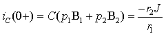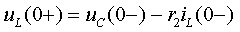 Второе уравнение получим из анализа неосновных начальных условий, которые определяются исследованием энергетического состояния цепи для момента времени t = 0+. К этим условиям относят численные значения напряжений на индуктивностях и токов в емкостях в первый момент после коммутации, которые претерпевают скачок в момент коммутации и связаны с переменными состояния известными дифференциальными соотношениями: