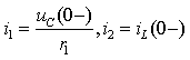 Для рассматриваемого примера анализируемая схема цепи представлена на рис.3.15б. Особенностью этой цепи по сравнению с исходной является появление двух новых внутренних источников энергии, которые обусловлены законами коммутации и перешли в анализируемую схему из предыдущей схемы рис.3.15а. Фактически исследуется цепь постоянного тока, содержащая резистивные элементы, а также внешние и внутренние источники энергии. Расчет цепи может выполняться любым методом. Целесообразно, например, использовать законы Кирхгофа или метод наложения.