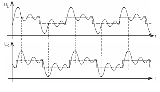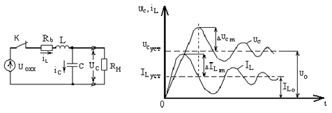 Фильтр используется при большой мощности нагрузки. К достоинствам фильтра относится: малые габаритные размеры, малая зависимость коэффициента сглаживания от изменений тока нагрузки (различный характер зависимости q от Iн для реактивных элементов взаимно компенсирует влияние). Недостатки: в таких фильтрах возникают переходные процессы, усложняющие работу, как потребителя, так и источника питания, дроссели фильтров имеют большие габаритные размеры и массу, а их индуктивность, следовательно, коэффициенты сглаживания зависят от тока нагрузки. При включении и отключении сети, а также при резких изменениях нагрузки в фильтре возникают переходные процессы, которые могут привести к перенапряжениям и броскам тока в элементах фильтра и выпрямителя. Возникновение переходных процессов связано с изменением во времени запасов электромагнитной энергии, накапливаемой в таких энергоемких элементах, как катушки индуктивности ( ) и конденсаторы фильтра ( ). При или разряд индуктивности или конденсатора фильтра происходит за некоторый интервал времени ( ), который определяет время переходного процесса. Несмотря на малую продолжительность этих процессов, они могут быть причиной выхода из строя вентилей из-за резкого возрастания обратного напряжения и прямого тока, а также пробоя конденсаторов или изоляции дросселей и силового трансформатора. Переходные процессы могут носить колебательный характер. В этом случае их можно рассматривать как свободные, затухающие при подключении фильтра к источнику постоянного тока. Собственная частота этих колебаний определяется выражением: На рисунке представлена графическая зависимость переходного процесса при включении источника питания:
