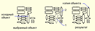 Вершина – переход в режим управления вершинами полилинии; След – переход к следующей вершине; Пред – переход к предыдущей вершине; Разорвать – разрыв полилинии в текущей вершине; ВСтавить – вставка новой вершины вслед за текущей; ПЕренести – перенос текущей вершины в другую точку; РЕген – регенерация полилинии; Выпрямит ь – выпрямление криволинейного сегмента до текущей вершины; Касательная – нанесение вектора касательной из текущей вершины в заданном направлении; Ширина – изменение ширины сегмента в начале и конце сегмента; выХод – выход из режима управления вершинами; Сгладь – сглаживание ломаной полилинии; Сплайн – сглаживает полилинию сплайнами; Убрать сглаживание – убирает сглаживание; Типлин – включает/отключает тип линии по всей длине; Отменить – отменяет последнее действие. Редактирование чертежа. Копирование объектов: Имеется возможность однократно и многократно копировать объекты по одному или группами в пределах текущего рисунка. Команда КОПИРУЙ выполняет копирование одного или нескольких объектов в другое место и активизируется в командной строке или из меню РЕДАКТ / КОПИРОВАТЬ. Для выполнения копирования команда запрашивает объекты для копирования, базовую точку (для привязки курсора к выбранным объектам) и точку перемещения для вставки копии (рис. 2.35). Опция Несколько позволяет перейти в режим многократного копирования. 1 – базовая точка; 2 – точка перемещения Кроме обычного копирования, имеются и другие способы размножения объектов на чертеже: 1)построение объектов, зеркально симметричных исходным относительно заданной оси; 2)размножение объекта массивом, когда создаются копии, расположенные в узлах прямоугольной сетки или равномерно по окружности; 3)построение подобных объектов, расположенных на указанном расстоянии от исходных или проходящих через указанные точки. Команда ЗЕРКАЛОвыполняет построение копии объекта по правилам осевой симметрии относительно оси отражения (симметрии), определяемой двумя точками, указанными пользователем. Команда МАССИВвыполняет размещение копий объектов массивом в круговом массиве (упорядоченно по окружности) или в узлах прямоугольного массива. Для круговых массивов задаются центр массива, количество элементов массива, включая исходный, угол заполнения массива (от 0 до 360) и режим их поворота. Для прямоугольных массивов задается количество строк и столбцов, а также расстояние между ними. Команда ПОДОБИЕ создает новые объекты, подобные выбранным и расположенные на заданном расстоянии от них. Подобные объекты имеют большие или меньшие размеры по отношению к исходному объекту, в зависимости от того, с какой стороны указано смещение. Если смещение указано точкой во внутренней области объекта, подобный объект имеет меньшие размеры, если во внешней области – большие. Для построения подобного объекта путем задания смещения необходимо задать значение смещения указанием двух точек или вводом с клавиатуры, выбрать исходные объекты для построения им подобных, указать сторону смещения. После построения можно выбрать следующий объект или нажать ENTER для завершения команды. В следующих примерах создается многоугольник, подобный исходному многоугольнику для двух случаев: 1)с величиной смещения между сторонами 5 мм; 2)ребро подобного многоугольника проходит ч