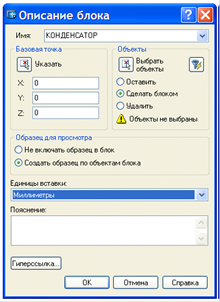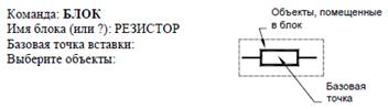 Ответ: Для создания блока необходимо выполнить его определение, в которое входят: имя блока, базовая точка вставки, графические объекты. Описания блоков можно создавать следующими командами: БЛОК – группирует объекты для использования только в текущем рисунке, при этом описание блока пользователь формирует, отвечая на запросы в командном окне; СБЛОК – аналогична команде БЛОК, при этом описание блока создается с помощью диалогового окна «Создание описания блока»; ПБЛОК – группирует объекты с записью их в отдельный файл. Этот файл используется затем для вставок блока в другие рисунки. Далее приведен пример создания с помощью команды БЛОК условного обозначения резистора. Объекты, входящие в блок могут быть выбраны любым из возможных способов. После создания блока объекты, из которых он был сформирован, удаляются из чертежа. «Описание блока» (рис. 2.41), в котором задаются определения блока. Для оперативного просмотра имен уже имеющихся блоков используется кнопка «Список имен блоков». Чтобы оставить на чертеже объекты, формирующие блок после его создания, необходимо установить переключатель «Оставить».